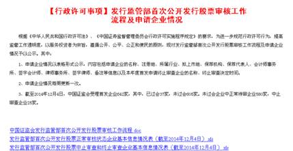 贯彻落实国务院有关工作要求,2014年2月17日在网站全面公开中国证监会行政审批事项目录,公开的内容包括项目编码、审批部门、项目名称、设定依据、审批对象,以及收集社会各界对进一步取消和下放行政审批项目意见的具体方式等,接受全社会监督。发布发行审核委员会工作会议公告和审核结果公告201期。发布上市公司并购重组审核委员会工作会议公告和审核结果公告160期。公开行政许可批复1282件。公开首次公开发行企业信息披露质量抽查抽签情况及监管问答等17期、预披露及补充预披露企业877家次。对首次公开发行股票、上市公司并购重组、证券投资基金募集、证券机构、基金管理公司、资信评级机构等的行政许可事项受理及审核进度情况每周予以更新发布。