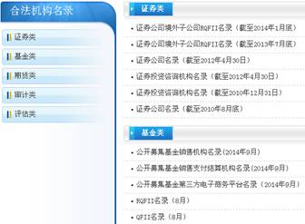 在“机构名录”栏目发布证券类名录1期、基金类名录65期。在“国际部”栏目发布《主板境外上市外资股公司名录》6期、《创业板境外上市外资股公司名录》6期、《外国证券类机构驻华代表机构名录》5期、《境外上市外资股筹资统计简表》6期、《QFII一览表》8期、《QFII托管行一览表》6期、《外资参股证券公司一览表》8期、《外资参股基金公司一览表》8期、《中国证监会与境外证券(期货)监管机构签署的备忘录一览表》4期。