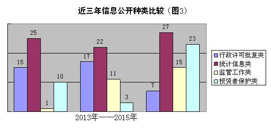 2015年主动公开信息中,统计信息类30条次,占比25.4%;通知公告类信息27条次,占比22.9%;投资者保护类信息23条次,占比19.5%;监管工作类信息15条次,占比12.7%;行政许可批复类信息7条,占比5.9%;指南指引类信息6条次,占比5.1%,辅导企业类信息6条,占比5.1%;其他信息4条,占比3.4%。与近几年相比,行政许可批复类信息减少,监管工作动态、投资者保护、统计信息、通知公告等监管服务类信息明显增长,详见下图2、图3: