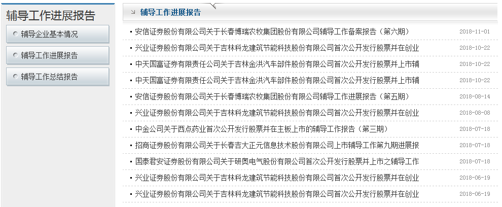 在“辅导企业信息”栏目发布信息49件。主要包括辅导企业基本情况、辅导工作进展报告以及企业辅导备案信息等