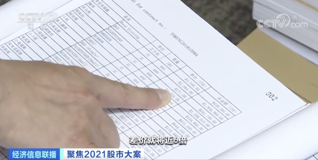 证监会稽查人员:有一个实例给大家看。这一本是它的真实报价记录,这一本是它的出口报关记录。这个梳妆台的真实报价,只有205美元,但是在出口报关的时候,梳妆台报价高达1359美元,差价将近6倍。