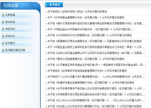 为提高政策法规制定的科学性和民主性,就《首次公开发行股票并在创业板上市管理办法(征求意见稿)》、《创业板上市公司证券发行管理暂行办法(征求意见稿)》、《非上市公众公司收购管理办法(征求意见稿)》、《非上市公众公司重大资产重组管理办法(征求意见稿)》等18件部门规章和规范性文件,通过我会网站公开征求意见。