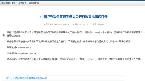 贯彻落实国务院有关工作要求,2014年2月17日在网站全面公开中国证监会行政审批事项目录,公开的内容包括项目编码、审批部门、项目名称、设定依据、审批对象,以及收集社会各界对进一步取消和下放行政审批项目意见的具体方式等,接受全社会监督。发布发行审核委员会工作会议公告和审核结果公告201期。发布上市公司并购重组审核委员会工作会议公告和审核结果公告160期。公开行政许可批复1282件。公开首次公开发行企业信息披露质量抽查抽签情况及监管问答等17期、预披露及补充预披露企业877家次。对首次公开发行股票、上市公司并购重组、证券投资基金募集、证券机构、基金管理公司、资信评级机构等的行政许可事项受理及审核进度情况每周予以更新发布。