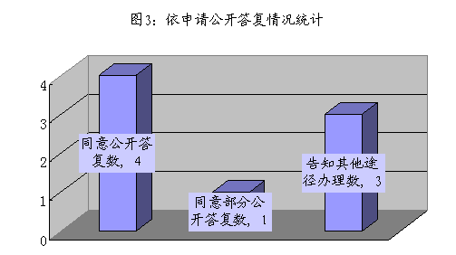 2016年,我局共收到信息公开申请8件,全部为信函申请,均已按时办结。其中,同意公开答复4件、同意部分公开答复1件、告知通过其他途径办理3件。各类答复统计情况如下图3: