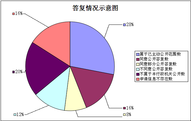 我局对收到的25件申请全部进行了答复,其中,4件在法定期限内作出了答复,21件延期答复,延期答复主要原因为一次申请事项较多,涉及内容复杂。其中,属于已主动公开范围7件,占28%;同意公开4件,占16%;同意部分公开2件,占8%;不同意公开3件,占12%,不同意公开的理由为申请公开的信息涉及商业秘密及个人隐私;不属于本行政机关公开的5件,占 20%;申请信息不存在的4件,占16%。