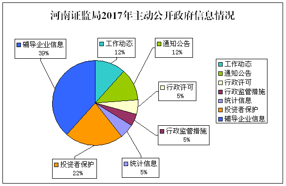 2017年,河南证监局共完成310条公开信息的整理、审查和公开发布。其中工作动态36条、通知公告38条、行政许可事项17条、行政监管措施14条、统计信息17条、投资者保护68条、辅导企业信息120条。具体情况见下图: