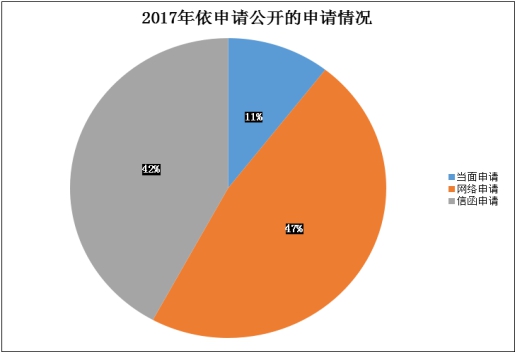 2017年,我局共收到政府信息公开申请19件,较去年同期减少62.74%。其中,当面申请2件,占11%;信函申请8件,占42%,网络申请9件,占47%。随着网络科技的发展,网上申请政务信息公开成为主流。