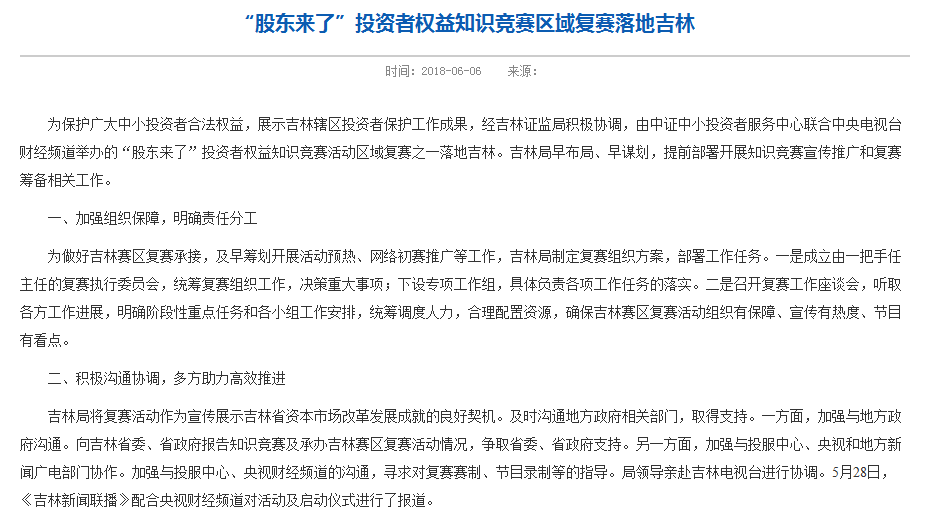 一是为保护广大中小投资者合法权益,展示吉林辖区投资者保护工作成果,吉林局早布局、早谋划,提前部署开展知识竞赛宣传推广和复赛筹备相关工作。经我局积极协调,由中证中小投资者服务中心联合中央电视台财经频道在吉林成功举办了“股东来了”投资者权益知识竞赛活动区域复赛。