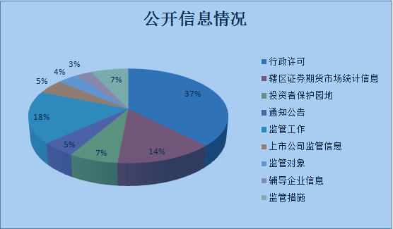 按照《条例》和《办法》要求,我局主动公开的监管信息包括机构设置、工作职责、联系方式、监管工作、监管对象、通知公告、行政许可、行政监管措施和行政处罚等信息;辖区证券期货市场统计信息、辅导企业信息和投资者保护园地等。2018年,我局通过证监会网站主动发布、更新各类信息共101条,优化了信息内容。其中,行政许可信息38条,监管措施7条,监管工作18条,监管对象4条,统计信息14条,辅导企业信息3条,上市公司监管信息5条,通知公告5条,投资者保护园地7条。