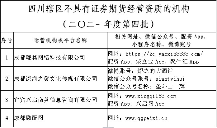 经群众举报及我局日常监管发现,成都曜鑫网络科技有限公司、成都深海之鲨文化传媒有限公司、宜宾兴启商务信息咨询有限公司、成都赚配网等4家机构或平台涉嫌违规开展证券投资咨询、场外配资等业务,相关名单见下表。