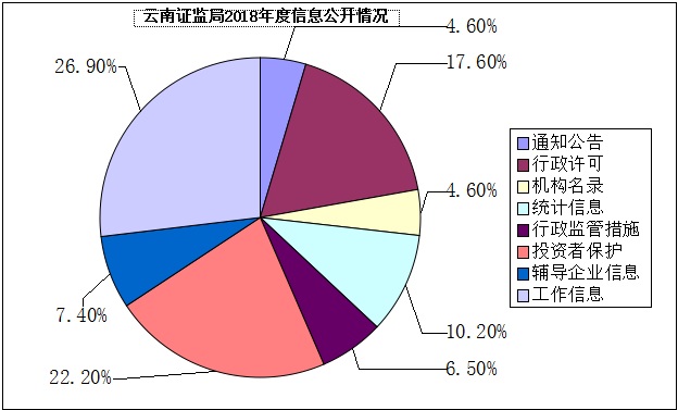 为充分发挥政府信息公开对提高辖区市场监管能力、防控风险及促进资本市场健康发展的保障作用,根据《中华人民共和国政府信息公开条例》(下称“《条例》”)、《中国证券监督管理委员会证券期货监管信息公开办法(试行)》(下称“《办法》”)和《云南证监局证券期货监督管理信息公开指南》(下称“《指南》”)有关规定,现公布云南证监局2018年监管信息公开年度报告。本报告内容包括主动公开信息情况、依申请公开信息情况、信息公开收费情况、因信息公开申请行政复议及提起行政诉讼情况。