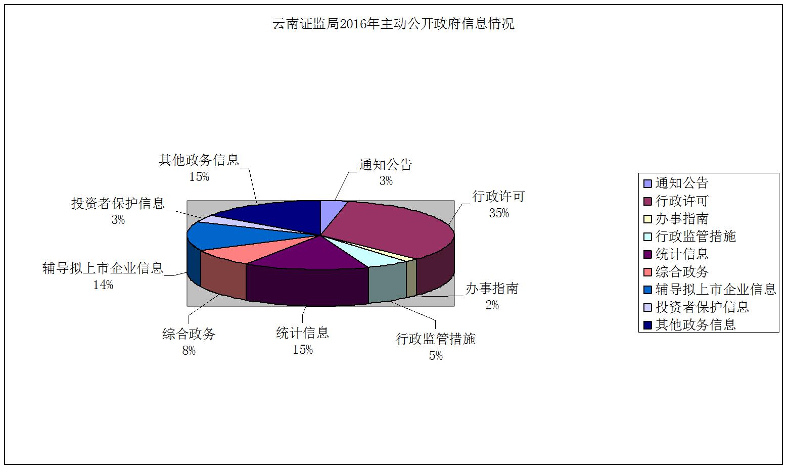 2016年,我局主动公开监管信息59条,均通过云南证监局门户网站公开。其中通知公告类信息2条,约占3.39%;行政许可类信息20条,约占33.9%;办事指南类信息1条,约占1.69%;行政监管措施类信息3条,约占5.08%;统计类信息9条,约占15.25%;综合政务类信息5条,约占8.47%;拟上市企业辅导工作信息8条,约占13.56%;投资者保护类信息2条,约占3.39%;其他政务信息9条,约占15.25%。与2015年监管信息公开情况相比,我局主动公开监管信息数量有所下降,主要原因是2016年我局贯彻落实中国证监会简政放权各项部署,取消部分行政审批事项,因此接收和批复的行政许可申请数量较2015年减少,主动公开的行政许可类信息也相应减少。