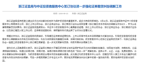 5月20日,我局和中证中小投资者服务中心有限责任公司、浙江上市公司协会、浙江证券业协会、浙江期货行业协会共同签署《浙江辖区资本市场纠纷调解合作协议》,并为10名兼职调解员发放聘书。根据合作协议,我局将积极组织、引导辖区证券期货经营机构、上市公司等市场主体采用调解方式解决纠纷,引导投资者委托投资者服务中心调解解决与市场主体间的纠纷,与各方共同推动完善辖区诉调、仲调对接机制。同时,通过“四大报”等新闻媒体宣传报道此项工作。
