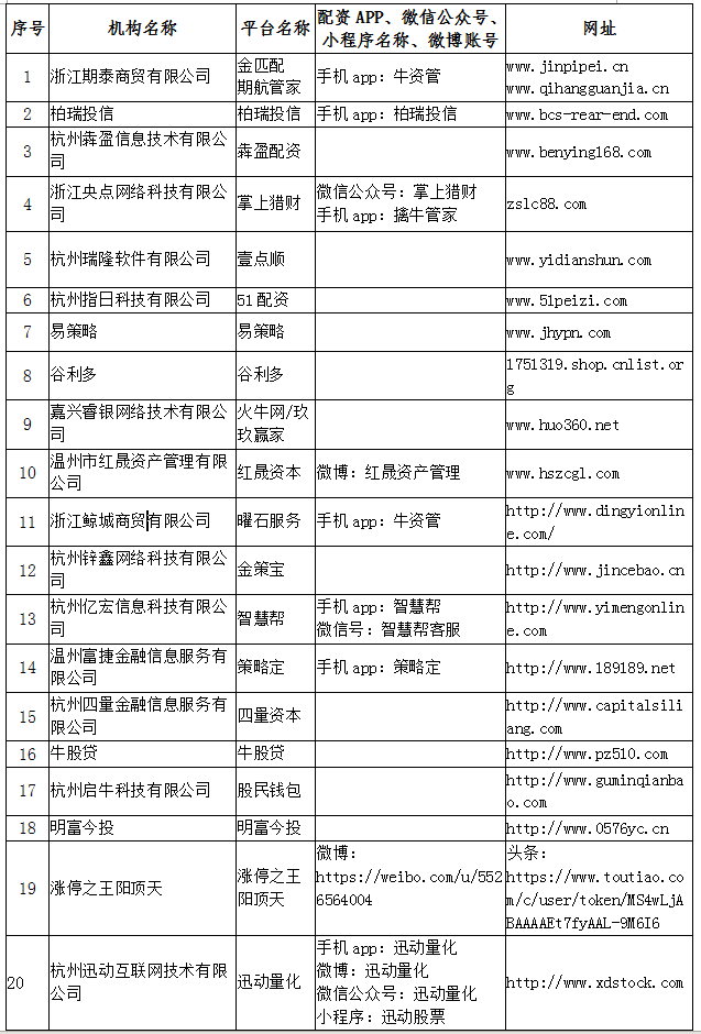 经核实,上述机构不具备证券期货经营业务资质。浙江证监局提醒广大投资者:未经批准,任何单位和个人不得经营证券期货业务。请广大投资者提高风险防范意识,拒绝高额收益诱惑,远离“股市黑嘴”“非法荐股”“场外配资”。